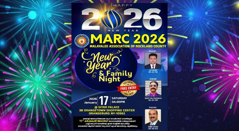 ന്യൂയോര്ക്ക്: മലയാളി അസോസിയേഷന് ഓഫ് റോക്ക് ലാന്ഡ് കൗണ്ടിയുടെ (മാര്ക്) ഫാമിലി നൈറ്റും ന്യൂ ഇയര് ആഘോഷവും ജനുവരി 17-ാം തീയതി ഓറഞ്ച് ബര്ഗിലുള്ള സിത്താര് പാലസില് വെച്ച് വൈകുന്നേരം 4 മണിക്ക് നടത്തും.