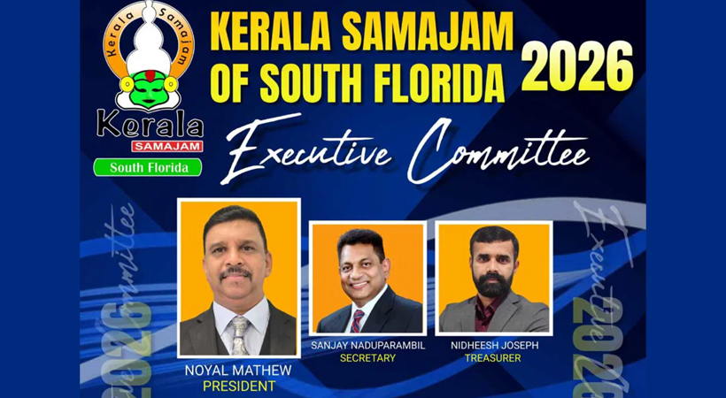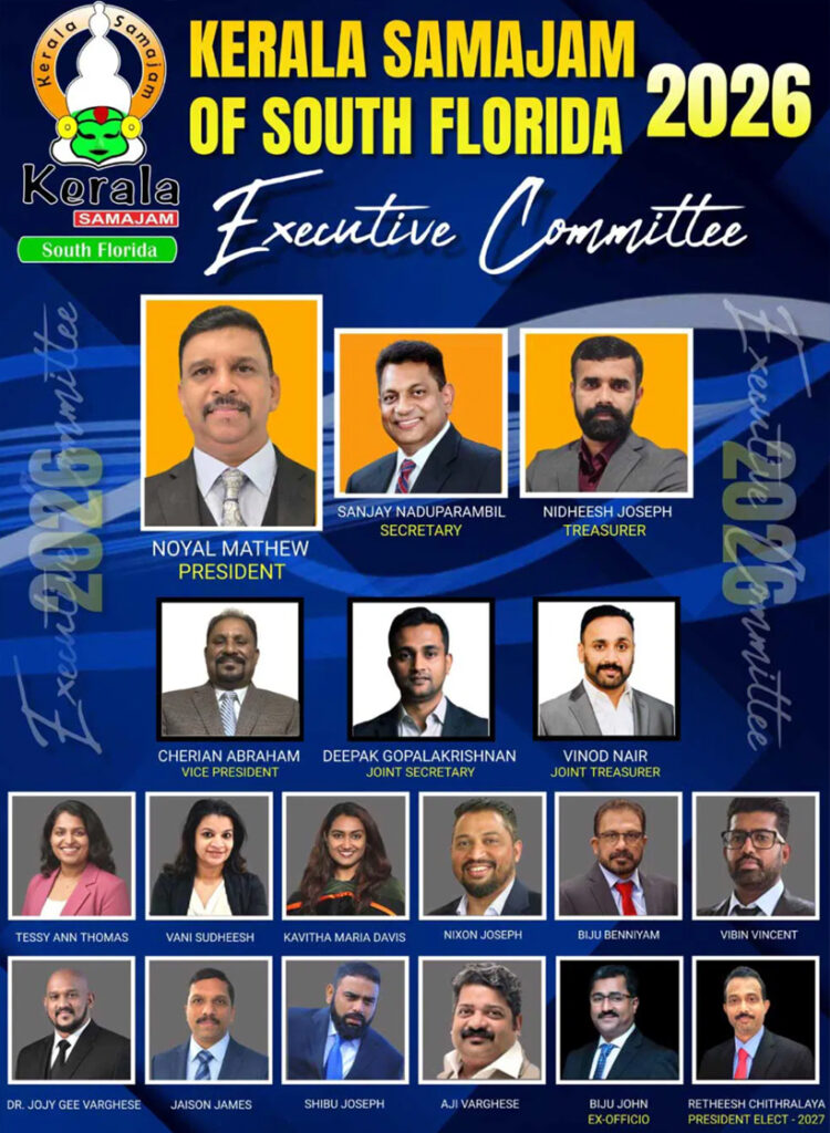 സൗത്ത് ഫ്ലോറിഡ: കേരളസമാജം ഓഫ് സൗത്ത് ഫ്ലോറിഡയുടെ 43-)0 പ്രസിഡന്റ് ആയി നോയൽ മാത്യുവിന്റെ നേതൃത്വത്തിൽ 18 അംഗ ഭരണസമിതി 2026 ജനുവരി ഒന്നിന് നിലവിൽ വന്നു. ഡിസംബർ 13, 2025 നു ചേർന്ന കേരളസമാജം സൗത്ത് ഫ്ലോറിഡയുടെ പൊതുയോഗമാണ് പുതിയ ഭരണസമിതിക്ക് അംഗീകാരം നൽകിയത്.