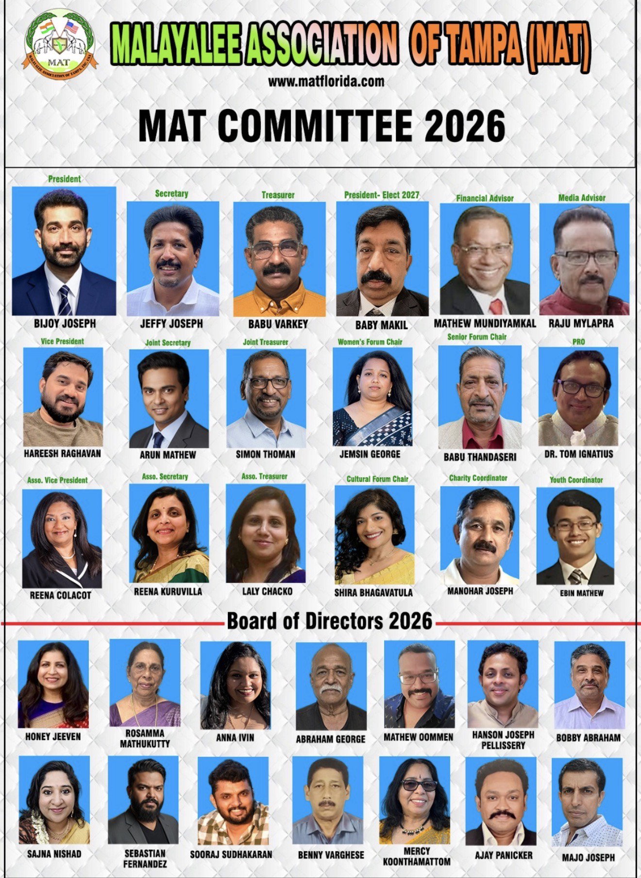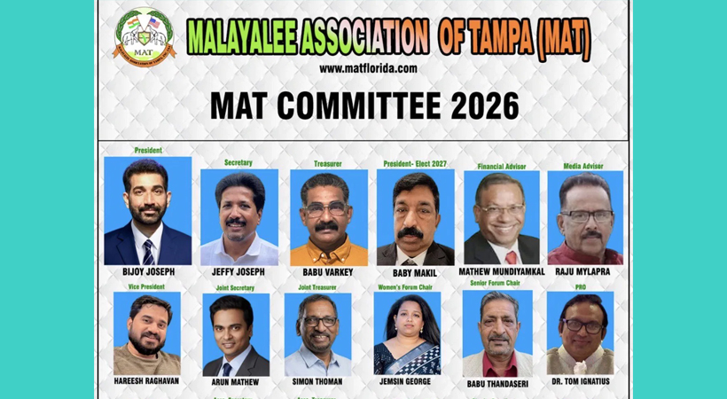 ടാമ്പ: മലയാളി അസോസിയേഷന് ഓഫ് ടാമ്പായുടെ 13-ാമത് പ്രസിഡന്റായി തിരഞ്ഞെടുക്കപ്പെട്ട ബിജോയ് ജോസഫിന്റെ നേതൃത്വത്തിലുള്ള ഭരണസമിതി ചുമതലയേറ്റു. മുന് പ്രസിഡന്റ് ജോണ് കല്ലോലിക്കലിന്റെ അദ്ധ്യക്ഷതയില് ചേര്ന്ന പൊതുയോഗമാണ് പുതിയ ഭരണ സമിതിക്ക് അംഗീകാരം നല്കിയത്.