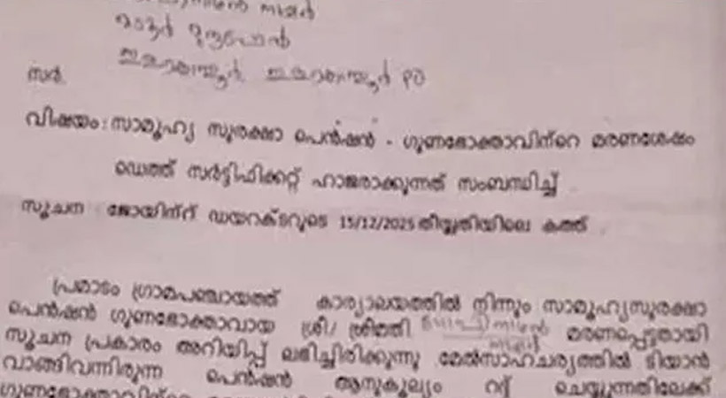 മരണസർട്ടിഫിക്കറ്റ് ഹാജരാക്കാനാണ് പ്രമാടം പഞ്ചായത്തിൽ നിന്ന് ഗോപിനാഥൻ നായർക്ക് ലഭിച്ച നോട്ടീസിൽ പറയുന്നത്. സാമൂഹിക സുരക്ഷാ പെൻഷൻ റദ്ദാക്കുന്നതിനായിരുന്നു നോട്ടീസ്. മൂന്ന് ദിവസത്തിനകം മരണ സർട്ടിഫിക്കറ്റ് ഹാജരാക്കണമെന്നായിരുന്നു നിർദേശം. ഗോപിനാഥനെ ആധാർ കാർഡുമായി ഇന്ന് പഞ്ചായത്തിൽ നേരിട്ട് എത്തിച്ച് ജീവനോടെയുണ്ടെന്ന് ബോദ്ധ്യപ്പെടുത്തുമെന്ന് മകൻ നേരത്തേ അറിയിച്ചിരുന്നു. ജോയിന്റ് ഡയറക്ടറുടെ ഓഫീസിൽ നിന്ന് ലഭിച്ച പട്ടികയുടെ അടിസ്ഥാനത്തിലാണ് നോട്ടീസ് അയച്ചതെന്നായിരുന്നു പഞ്ചായത്ത് സെക്രട്ടറിയുടെ വിശദീകരണം.