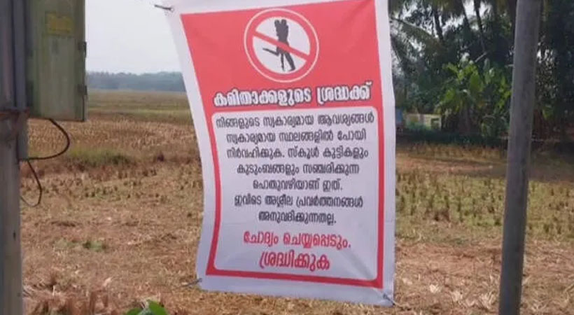 കമിതാക്കളുടെ ശ്രദ്ധയ്ക്ക്, നിങ്ങളുടെ സ്വകാര്യമായ ആവശ്യങ്ങൾ സ്വകാര്യമായ സ്ഥലങ്ങളിൽ പോയി നിർവഹിക്കുക, സ്കൂൾ കുട്ടികളും കുടുംബങ്ങളും സഞ്ചരിക്കുന്ന പൊതുവഴിയാണ് ഇത്. ഇവിടെ അശ്ലീലപ്രവർത്തനങ്ങൾ അനുവദിക്കുന്നതല്ല. ചോദ്യം ചെയ്യപ്പെടും. ശ്രദ്ധിക്കുകയെന്നാണ് ബോർഡിലുള്ളത്.