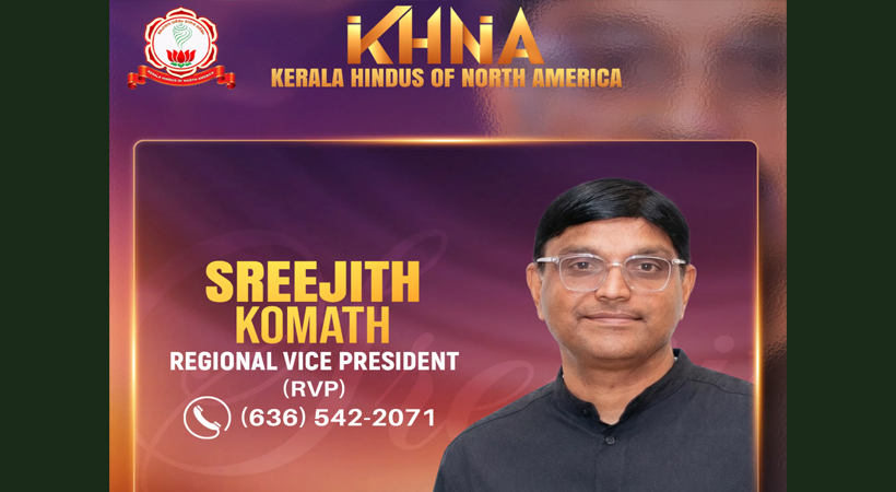 ഫിലാഡല്ഫിയ: നോര്ത്ത് അമേരിക്കയിലെ മലയാളി ഹിന്ദുക്കളുടെ കേന്ദ്ര സംഘടനയായ Kerala Hindus of North America (കെ.എച്ച്.എന്.എ) മിഡ് അറ്റ്ലാന്റിക് റീജിയണല് വൈസ് പ്രസിഡന്റായി (RVP) പ്രമുഖ സാമൂഹിക പ്രവര്ത്തകനും ഐ.ടി. പ്രൊഫഷണലുമായ ശ്രീജിത്ത് കോമത്തിനെ നാമനിര്ദേശം ചെയ്തു. ഗ്രേറ്റര് ഫിലാഡല്ഫിയ മേഖലയിലെ സാംസ്കാരിക-സാമൂഹിക രംഗങ്ങളില് സജീവ സാന്നിധ്യമായ ശ്രീജിത്തിന്, കെ.എച്ച്.എന്.എയുടെ പ്രവര്ത്തനങ്ങള് മിഡ് അറ്റ്ലാന്റിക് മേഖലയിലുടനീളം ഏകോപിപ്പിക്കുന്നതിന്റെ പ്രധാന ഉത്തരവാദിത്വമാണ് ഏല്പ്പിച്ചിരിക്കുന്നത്.