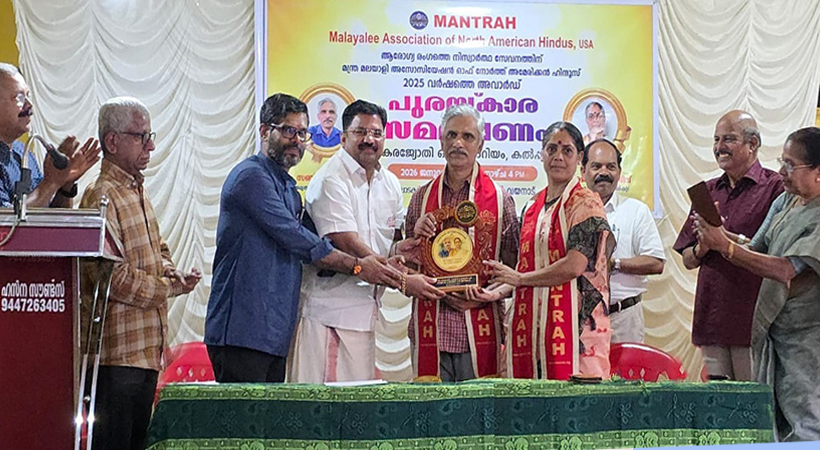 കൽപ്പറ്റ : ആരോഗ്യ രംഗത്തെ നിസ്വാർത്ഥ സേവനങ്ങളെ ആദരിച്ച് MANTRAH (Malayalee Association of North American Hindus – USA) നൽകുന്ന 2025 ലെ ‘സ്വാസ്ഥ്യ മിത്ര’ പുരസ്കാരം ഡോ. സഞ്ജീവ് വാസുദേവ്ക്കും ഡോ. അജിതാ സഞ്ജീവ്ക്കും സമർപ്പിച്ചു.