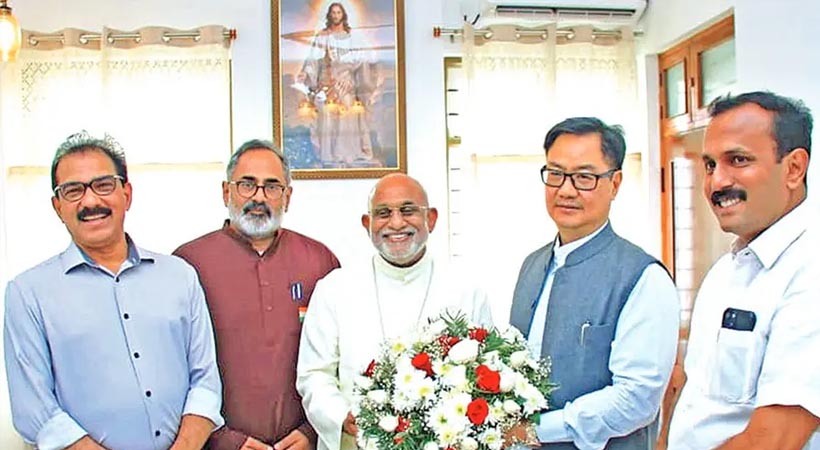ഫോട്ടോ: കേന്ദ്രമന്ത്രി കിരൺ റിജിജു കാക്കനാട് സെയ്ന്റ് തോമസ് മൗണ്ട് സിറോ മലബാർസഭാ ആസ്ഥാനത്തെത്തി മേജർ ആർച്ച് ബിഷപ്പ് മാർ റാഫേൽ തട്ടിലിനെ സന്ദർശിച്ചപ്പോൾ. ബി.ജെ.പി. സംസ്ഥാന അധ്യക്ഷൻ രാജീവ് ചന്ദ്രശേഖർ, ട്വന്റി 20 പ്രസിഡന്റ് സാബു എം. ജേക്കബ്, ബി.ജെ.പി. സംസ്ഥാന ഉപാധ്യക്ഷൻ ഷോൺ ജോർജ് എന്നിവർ സമീപം