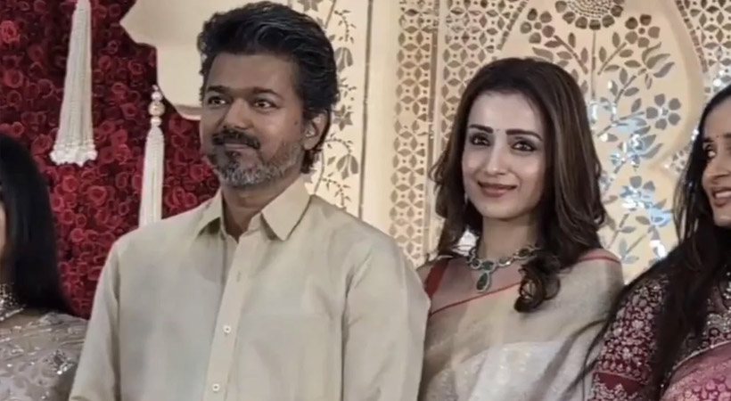 ഇപ്പോഴിതാ വിവാദങ്ങൾക്കിടെ വിജയും തൃഷയും വീണ്ടും ഒരുമിച്ച് ഒരു ചടങ്ങിനെത്തിയ വാർത്തയാണ് ഇപ്പോൾ ചർച്ചയാകുന്നത്. നിർമ്മാതാവ് കല്പാത്തി എസ്. സുരേഷിന്റെയും മീനാക്ഷി സുരേഷിന്റെയും മകന്റെ വിവാഹ സത്കാരത്തിനാണ് താരജോഡികൾ ഒന്നിച്ചെത്തിയത്. വിവാഹ മോചന വാർത്തകൾക്കിടെയാണ് താരങ്ങൾ ഒരുമിച്ചെത്തിയത് എന്നാണ് ശ്രദ്ധേയം. ഇതിന്റെ വീഡിയോയും ചിത്രങ്ങളും പുറത്തുവന്നു. ഒരുമിച്ച് ഒരു കാറിൽ വന്നിറങ്ങിയ ഇരുവരെയും സ്വീകരിച്ച് വിവാഹവേദിയിലേക്ക് ആനയിക്കുന്നത് വീഡിയോയിൽ കാണാം. മാച്ചിംഗ് വസ്ത്രങ്ങളാണ് വിജയും തൃഷയും ധരിച്ചിരിക്കുന്നവത് എന്നും ആരാധകർ കണ്ടെത്തി. ഓഫ് വൈറ്റിൽ ചുവന്ന ബോർഡറുള്ള കാഞ്ചീവരം സാരിയും ചുവന്ന സ്ലീവ്ലെസ് ബ്ലൗസുമാണ് തൃഷ ധരിച്ചിരുന്നത്. വിജയ് ആകട്ടെ ഓഫ് വൈറ്റ് സിൽക്ക് ഷർട്ടും മാച്ചിംഗ് മുണ്ടുമാണ് ധരിച്ചത്.