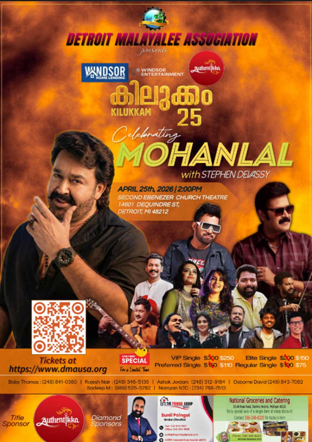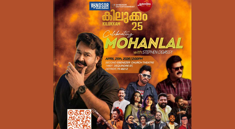 ഡിട്രോയിറ്റ് മലയാളി അസോസിയേഷൻ (DMA) അവതരിപ്പിക്കുന്ന മഹാമേള “കിലുക്കം 25 — മോഹൻലാൽ ലൈവ് സ്റ്റേജ് ഷോ” മിഷിഗണിലെ മലയാളി സമൂഹത്തിന് ഒരിക്കലും മറക്കാനാകാത്ത അനുഭവമാകുമെന്ന് ഉറപ്പ്. 2026 ഏപ്രിൽ 25-ന് ഉച്ചതിരിഞ്ഞ് രണ്ട് മണിക്ക് ഡിട്രോയ്റ്റിലെ സെക്കൻഡ് എബനേസർ ചർച്ച് ഓഡിറ്റോറിയത്തിൽ (14601 DeQuindre St, Detroit, MI 48212) ആണ് ഈ കലാവിരുന്ന് അരങ്ങേറുന്നത്.