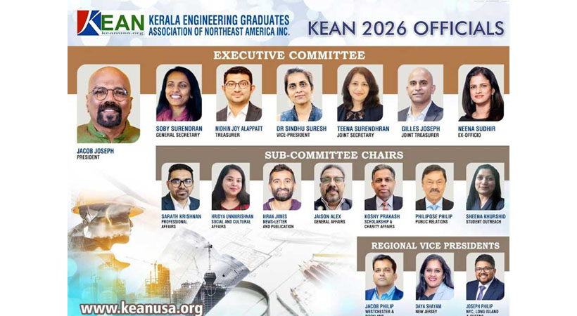കേരള എൻജിനീയേഴ്സ് അസോസിയേഷൻ ഓഫ് നോർത്ത് ഈസ്റ്റ് അമേരിക്ക (KEAN) കൈമാറ്റ ചടങ്ങും എഞ്ചിനീയർ വാരാഘോഷവും ഫെബ്രുവരി 28-ന് വെസ്റ്റ്ഫീൽഡ് കാസ ഡെൽ റേ, റോസെല്ലെ പാർക്ക്, NJ യിൽ അനേകം എന്ജിനീഴ്സിന്റെയും വിശിഷ്ട വ്യക്തികളുടെ സാന്നിധ്യത്തിൽ ആവേശകരമായി ആഘോഷിച്ചു. യോഗത്തിൽ മുൻ പ്രസിഡന്റ് നീന സുധീർ അദ്ധ്യക്ഷത വഹിച്ചു.