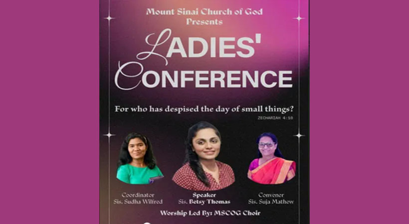 ഗാർലാൻഡ് (ഡാളസ് ): മൗണ്ട് സീനായ് ചർച്ച ഓഫ് ഗോഡ് സഭയുടെ നേതൃത്വത്തിൽ ഗാർലൻഡിൽ വനിതാ സമ്മേളനം സംഘടിപ്പിക്കുന്നു. 2026 മാർച്ച് 21-ന് രാവിലെ 9:30 മുതൽ ഉച്ചയ്ക്ക് 1:00 വരെ 5313 Robin Road, Garland, Texas എന്ന വിലാസത്തിലുള്ള സഭയിൽ സമ്മേളനം നടക്കും.