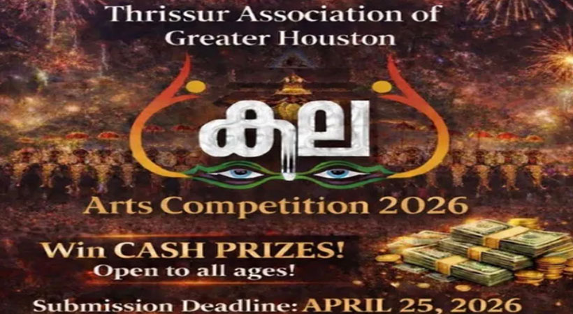 ഹൂസ്റ്റൺ: തൃശൂർ അസോസിയേഷൻ ഓഫ് ഗ്രേറ്റർ ഹൂസ്റ്റണിന്റെ ആഭിമുഖ്യത്തിൽ ‘കല 2026’ എന്ന പേരിൽ വിപുലമായ കലാമത്സരങ്ങൾ സംഘടിപ്പിക്കുന്നു. “തൃശൂർ – കേരളത്തിന്റെ സാംസ്കാരിക തലസ്ഥാനം” എന്ന പ്രമേയത്തെ ആസ്പദമാക്കിയാണ് മത്സരങ്ങൾ നടക്കുന്നത്. എല്ലാ പ്രായക്കാർക്കും പങ്കെടുക്കാവുന്ന ഈ മത്സരത്തിൽ ആകർഷകമായ പണക്കിഴികളാണ് വിജയികളെ കാത്തിരിക്കുന്നത്.