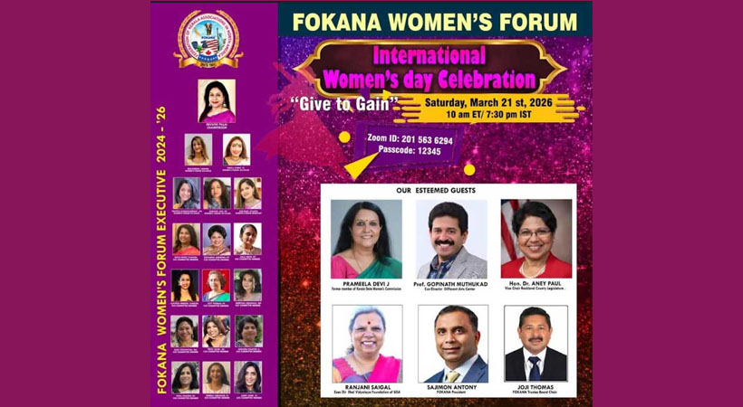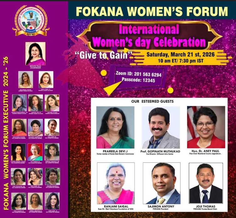 ന്യൂ യോർക്ക് : ഇന്റര്നാഷണല് വനിതാ ദിനാഘോഷത്തോട് അനുബന്ധിച്ചു ഫൊക്കാന നടത്തുന്ന വിമെൻസ്ഡേ സെലിബ്രേഷൻസ് 2026 മാര്ച്ച് 21 ശനിയാഴ്ച രാവിലെ 10 ( EST) മണിക്ക് സൂം മീറ്റിലൂടെ നടക്കും.