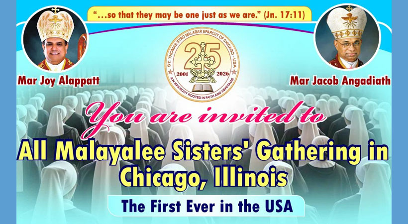 ചിക്കാഗോ: സിറോ മലബാർ ചിക്കാഗോ രൂപതയുടെ ഇരുപത്തിയഞ്ചാം വാർഷികാഘോഷങ്ങളുടെ ഭാഗമായി അമേരിക്കയിൽ ‘ഓൾ മലയാളി സിസ്റ്റേഴ്സ് സംഗമം’ 2026, ഏപ്രിൽ 17, 18 തീയതികളിൽ ചിക്കാഗോയിൽ അരങ്ങേറും. അമേരിക്കയിലെ സേവനമനുഷ്ഠിക്കുന്ന മലയാളി സമർപ്പിത സന്യാസിനികളുടെ ചരിത്രത്തിൽ ആദ്യമായാണ് ഇത്തരമൊരു വിപുലമായ സംഗമം സംഘടിപ്പിക്കപ്പെടുന്നത്.
