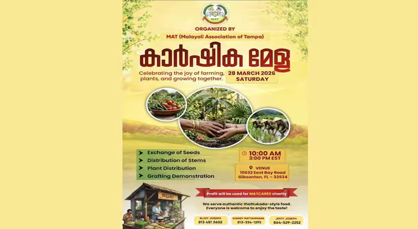 ടാമ്പാ (ഫ്ലോറിഡ): ടാമ്പാ മലയാളികള് ആവേശപൂര്വം കാത്തിരിക്കുന്ന മലയാളി അസോസിയേഷന് ഓഫ് ടാമ്പായുടെ ആഭിമുഖ്യത്തില് നടത്തപ്പെടുന്ന കാര്ഷിക മേള മാര്ച്ച് 28 ശനിയാഴ്ച രാവിലെ 10 മണി മുതല് ആരംഭിക്കുന്നതാണ്.മനസിനും ശരീരത്തിനും ഒരുപോലെ ഉണര്വും ഉന്മേഷവും നല്കുന്ന പച്ചക്കറി, പൂന്തോട്ട പരിപാലനത്തിന് ആവശ്യമായ വിത്തുവിളകളും, പരിശീലനവും കാര്ഷിക വിദഗ്ധരില് നിന്നും ലഭ്യമാണ്.നാടന് രുചി വിഭവങ്ങള് നിങ്ങളുടെ കണ്മുന്നില് തന്നെ ചൂടോടെ തയ്യാറാക്കി നല്കുന്ന ‘തട്ടുകട’ ഈ കാര്ഷിക മേളയുടെ ഒരു പ്രധാന ആകര്ഷണമായിരിക്കും.