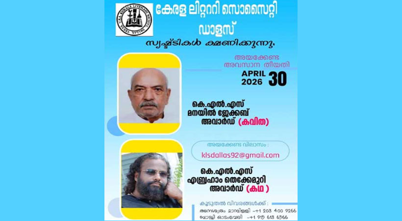 ഡാലസ് : അമേരിക്കയിൽ സർഗ വാസനയുള്ള മലയാളി എഴുത്തുകാരെ പ്രോത്സാഹിപ്പിക്കാനായി 1992 ൽ ഡാലസിൽ ആരംഭിച്ച എഴുത്തുകാരുടെയും സാഹിത്യ ആസ്വാദകരുടെയും സംഘടനയായ കേരള ലിറ്റററി സൊസൈറ്റി പ്രവാസി ഇന്ത്യക്കാർക്കായി ഏർപ്പെടുത്തിയിരിക്കുന്ന പ്രവാസി കഥ – കവിത പുരസ്കാരങ്ങൾക്ക് സൃഷ്ടികൾ ക്ഷണിക്കുന്നു. 25,000 രൂപയും പ്രശസ്തി പത്രവും അടങ്ങുന്നതാണ് രണ്ട് അവാർഡുകളും.