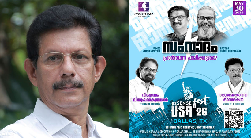 എസ്സെൻസ് ഗ്ലോബൽ USA യുടെ നേതൃത്വത്തിൽ ടെക്സസിലെ ഡാലസിൽ മെയ് 30 ശനിയാഴ്ച്ച നടത്തപെടുന്ന ശാസ്ത്ര സ്വതന്ത്ര ചിന്താ സെമിനാർ – “എസ്സെൻസ് ഫെസ്റ്റിൽ” പങ്കെടുക്കാൻ പ്രൊഫ: ടി ജെ ജോസഫ് അമേരിക്കയിലെത്തുന്നു.