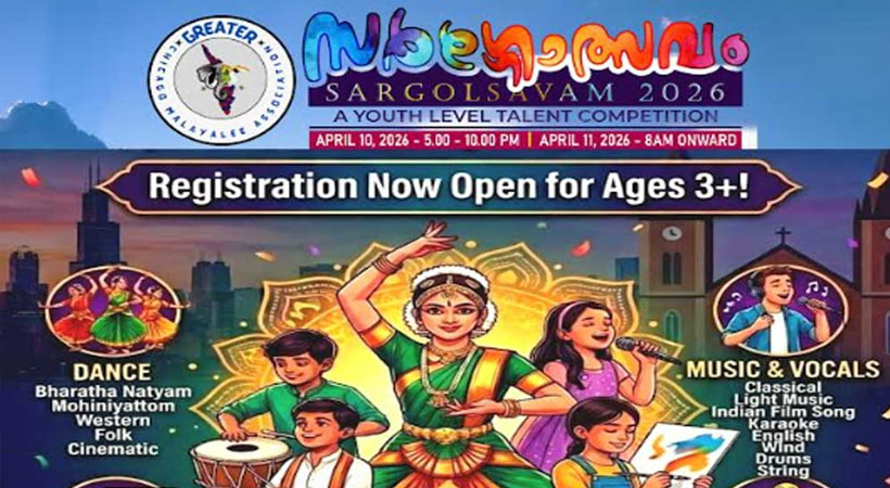 ഗ്രേറ്റർ ഷിക്കാഗോ മലയാളി അസോസിയേഷൻ (GCMA) സംഘടിപ്പിക്കുന്ന വിപുലമായ യുവജനോത്സവം ‘സർഗോത്സവം 2026’ ഏപ്രിൽ 11-ന് നടക്കും. 3 വയസ്സു മുതൽ 18 വയസ്സു വരെയുള്ള കുട്ടികൾക്കായി വിവിധ വിഭാഗങ്ങളിലായാണ് മത്സരങ്ങൾ ക്രമീകരിച്ചിരിക്കുന്നത്. ഷിക്കാഗോയിലെയും പരിസരപ്രദേശങ്ങളിലെയും പ്രതിഭകളായ കുട്ടികൾക്കും യുവാക്കൾക്കും തങ്ങളുടെ കലാവൈഭവം പ്രകടിപ്പിക്കാനുള്ള മികച്ച വേദിയായി സർഗോത്സവം മാറും.