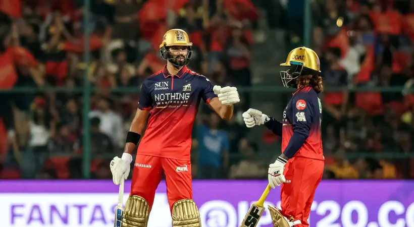 നേരത്തേ ആദ്യം ബാറ്റുചെയ്ത ബെംഗളൂരു നിശ്ചിത 20 ഓവറിൽ മൂന്ന് വിക്കറ്റ് നഷ്ടത്തിൽ 250 റൺസാണെടുത്തത്. ആർസിബിക്ക് മികച്ച തുടക്കമാണ് വിരാട് കോലിയും ഫിൽ സാൾട്ടും സമ്മാനിച്ചത്. ഇരുവരും പവർപ്ലേയിൽ മിന്നിച്ച് തുടങ്ങി. ആദ്യം തകർത്തടിച്ചത് കോലിയായിരുന്നു. 18 പന്തിൽ നിന്ന് 28 റൺസെടുത്ത കാേലി ആദ്യം പുറത്തായി. പിന്നീട് ഫിൽ സാൾട്ട് കത്തിക്കയറി. അതോടെ ആർസിബി സ്കോർ കുതിച്ചു. ദേവ്ദത്ത് പടിക്കൽ പതിയെ കളിച്ചപ്പോൾ സാൾട്ട് ഇന്നിങ്സ് മുന്നോട്ടുനയിച്ചു. പത്തോവർ അവസാനിക്കുമ്പോൾ 91-1 എന്ന നിലയിലായിരുന്നു ടീം. 11-ാം ഓവറിൽ 30 പന്തിൽ നിന്ന് 46 റൺസെടുത്ത സാൾട്ട് പുറത്തായി.