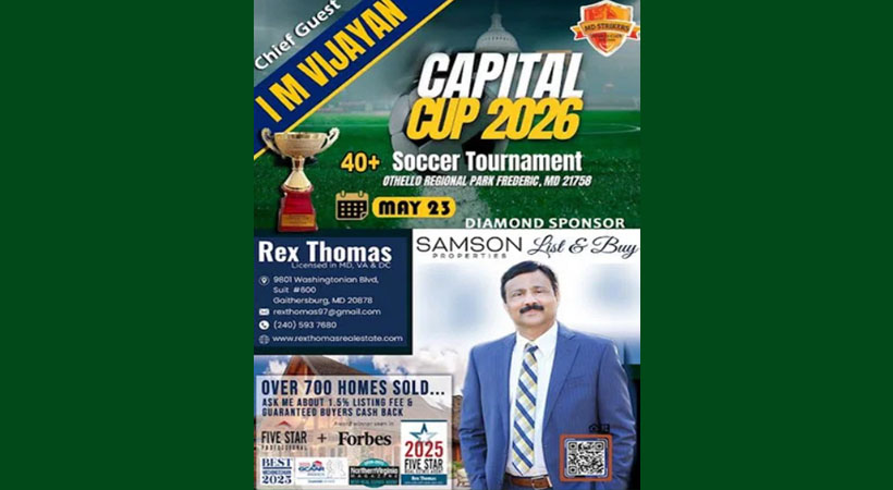 വാഷിംഗ്ടൺ ഡിസി: മേരിലാൻഡ് സ്ട്രൈക്കേഴ്സ് മെമ്മോറിയൽ വീക്കെൻഡായ മെയ് 23 ന് നടത്തുന്ന മൂന്നാമത് നോർത്ത് അമേരിക്കൻ ക്യാപിറ്റൽ കപ്പ് സോക്കർ ടൂർണമെന്റിനുള്ള ഒരുക്കങ്ങൾ പൂർത്തിയായതായി സംഘാടകർ അറിയിച്ചു .