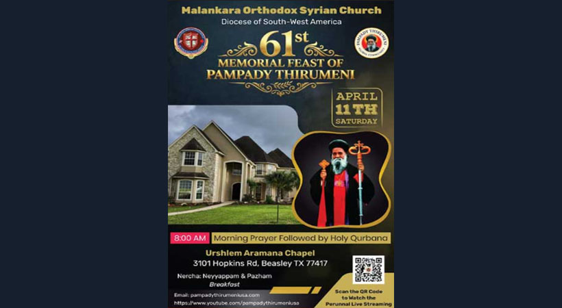 ഹ്യൂസ്റ്റൺ:പാമ്പാടി തിരുമേനിയുടെ 61-ാം ഓർമ്മപ്പെരുന്നാൾ 2026 ഏപ്രിൽ 11-ാം തീയതി (ശനിയാഴ്ച) ഹ്യൂസ്റ്റണിലെ ഉർശ്ലേം അരമന ചാപ്പലിൽ ഭക്ത്യാദരപൂർവ്വം ആചരിക്കും.