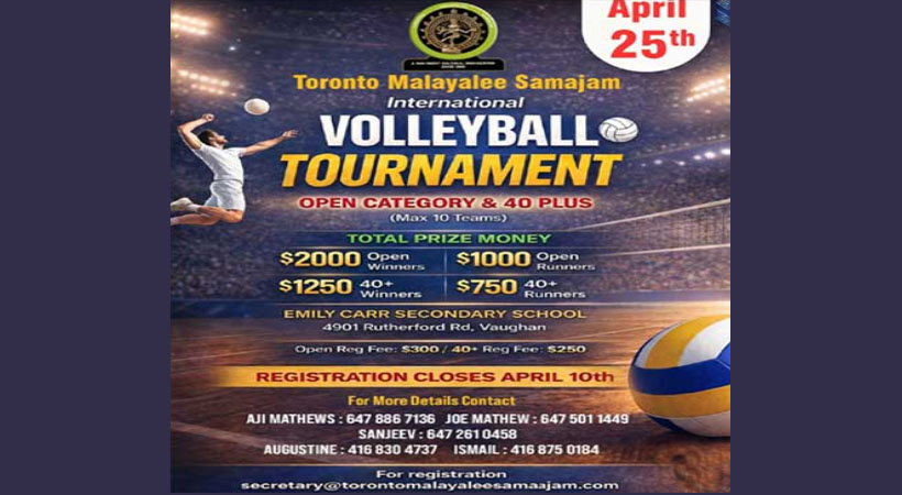 ഒന്റാരിയോ: ടൊറന്റോ മലയാളി സമാജം വോളിബോള് ടൂര്ണമെന്റ് ഏപ്രില് 25 ശനിയാഴ്ച ഒന്റാരിയോയില് നടക്കും. 4901 റൂഥര്ഫോര്ഡ് റോഡ്, വോണില് എമിലി കാര്(EMILY CARR) സെക്കണ്ടറി സ്കൂള് ഗ്രൗണ്ടിലാണ് മത്സരം നടക്കുക. ഓപ്പണ് കാറ്റഗറി, 40 പ്ലസ് എന്നീ കാറ്റഗറിയിലാണ് മത്സരം. മത്സരങ്ങള് രാവിലെ എട്ട് മണിക്ക് ആരംഭിക്കും. പത്തരയ്ക്ക് വിശിഷ്ടാതിഥികളെ പങ്കെടുപ്പിച്ചു കൊണ്ട് ഉദ്ഘാടനം ഔദ്യോഗികമായി നിര്വഹിക്കും.
