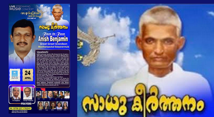 ഡാളസ് : പ്രശസ്ത ക്രൈസ്തവ പ്രസംഗകനും ഗാനരചയിതാവുമായിരുന്ന സാധു കൊച്ചുഞ്ഞ് ഉപദേശിയുടെ സ്മരണാർത്ഥം “സ്വർഗീയ നാദം” സംഘടിപ്പിക്കുന്ന ‘സാധു കീർത്തനം’ ലൈവ് സ്ട്രീമിംഗ് മ്യൂസിക് കൺസേർട്ട് ഏപ്രിൽ 24 വെള്ളിയാഴ്ച നടക്കും. സാധു കൊച്ചുഞ്ഞ് ഉപദേശിയുടെ (മൂത്തമ്പാക്കൽ ഇടയാറന്മുള) കൊച്ചുമകന്റെ മകനായ അനീഷ് ബെഞ്ചമിൻ ആണ് ഈ ‘ഫേസ് ടു ഫേസ്’ പരിപാടിയിൽ മുഖ്യാതിഥിയായി എത്തുന്നത്.