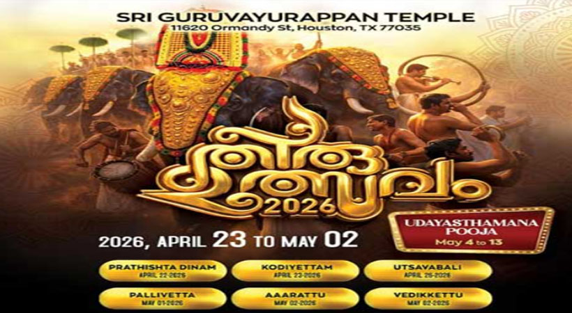 ഹൂസ്റ്റൺ, ടെക്സസ്: ഹൂസ്റ്റൺ ശ്രീ ഗുരുവായൂരപ്പൻ ക്ഷേത്രത്തിൽ പ്രതിഷ്ഠാദിനവും തിരുവുത്സവവും അനുബന്ധിച്ച് നടക്കുന്ന ഉത്സവ മഹോത്സവം ഏപ്രിൽ 22, 2026-ന് ഭക്തിനിറഞ്ഞ അന്തരീക്ഷത്തിൽ ആരംഭിക്കുന്നു.