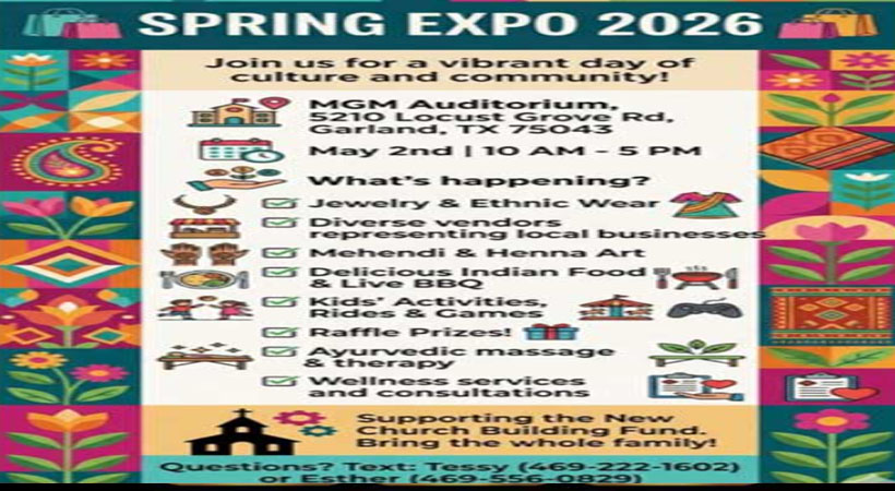 ഗാർലൻഡ് (ടെക്സാസ്): വസന്തകാലത്തിന്റെ വരവേൽപ്പിനായി വൈവിധ്യമാർന്ന കലാ-സാംസ്കാരിക പരിപാടികളോടെ ‘സ്പ്രിംഗ് എക്സ്പോ 2026’ സംഘടിപ്പിക്കുന്നു. പുതിയ പള്ളി മന്ദിരത്തിനായുള്ള ഫണ്ട് ശേഖരണാർത്ഥം നടത്തുന്ന ഈ മേള മെയ് 2-ാം തീയതി ശനിയാഴ്ച രാവിലെ 10 മണി മുതൽ വൈകുന്നേരം 5 മണി വരെ ഗാർലൻഡിലെ എം.ജി.എം ഓഡിറ്റോറിയത്തിൽ (MGM Auditorium, 5210 Locust Grove Rd, Garland, TX 75043) വെച്ച് നടക്കും.